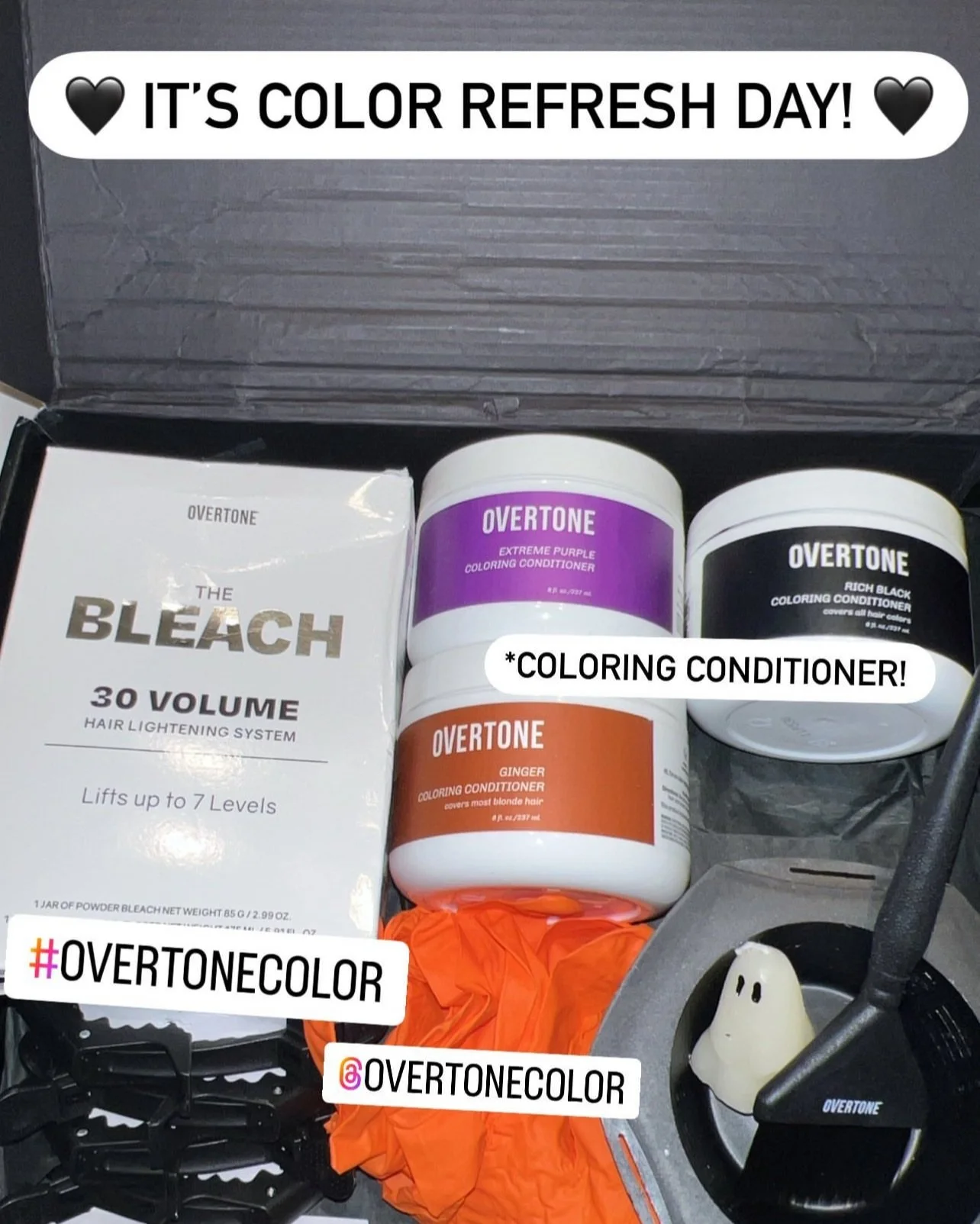 For Halloween, I created an unforgettable PR gifting campaign for Overtone by sending out over 300 themed PR boxes to top beauty influencers. Each box was carefully designed with spooky, fun elements that tied into the vibrant hair colors Overtone is known for, giving influencers everything they needed to create festive, bold looks. The campaign generated an overwhelming amount of excitement, resulting in thousands of Instagram stories, posts, and tags from influencers showing off their hair transformations.